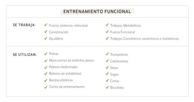 El entrenamiento funcional, ofrece a los clientes una manera práctica de mejorar sus capacidades con seguridad, incrementando con eficacia,y eficientemente actividades de la vida cotidiana y deportivas a todas las edades.
