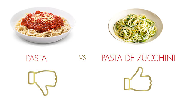 Pasta à Pasta de zucchini: Las pastas de harina refinada aportan calorías vacías y no muchos nutrientes. Cuando queremos bajar de peso los zucchinis son una mejor opción ya que tienen vitamina, antioxidantes, fibra y son bajos en calorías.