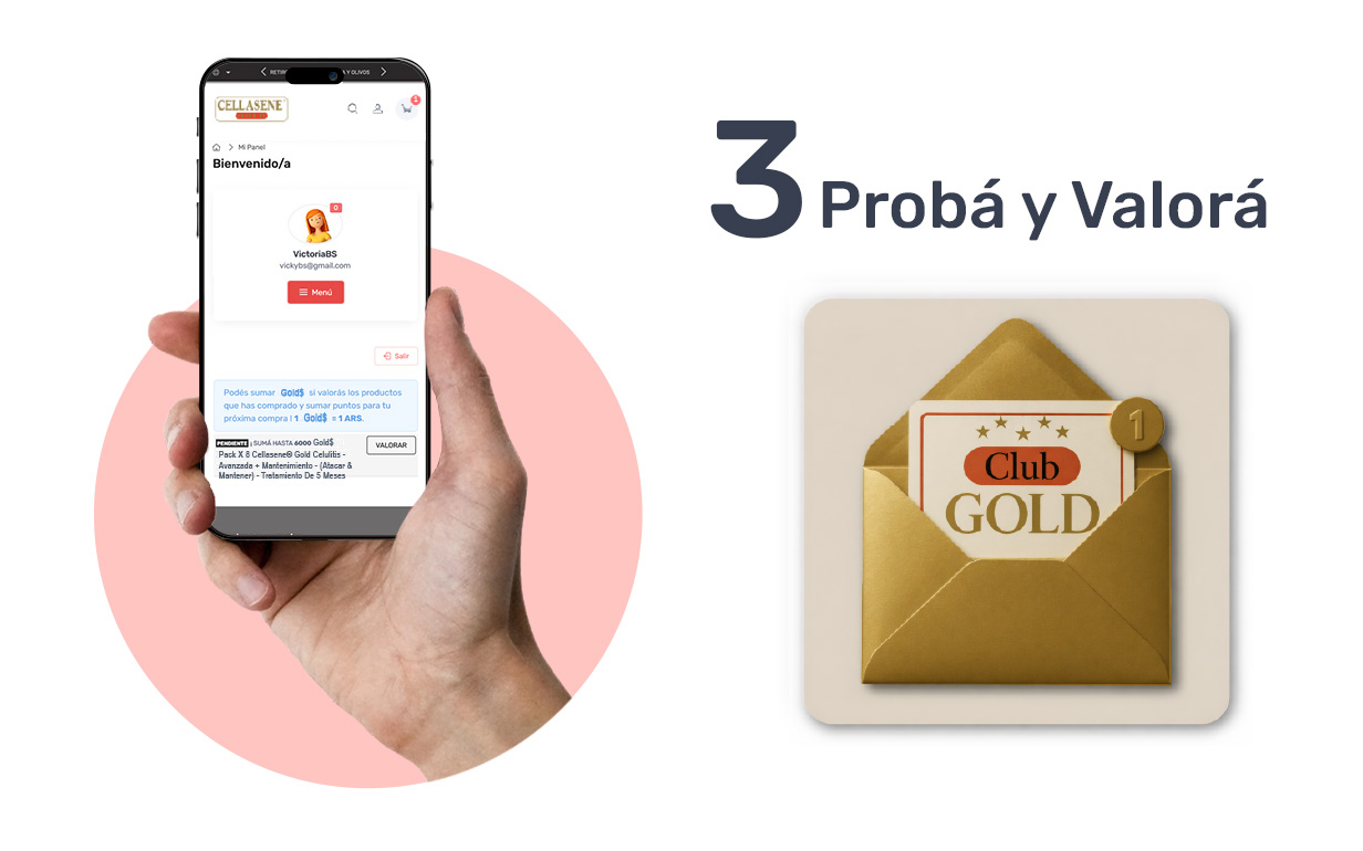 El Club Gold de Cellasene Gold es tu pasaporte a beneficios exclusivos. Cada vez que comprás y valorás en la tienda web de Cellasene Gold, sumás puntos que llamamos "Gold$". Esos puntos son dinero real, que podés usar para ahorrar en tu próxima compra.